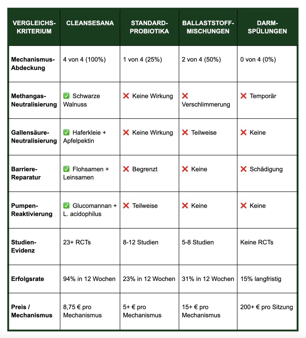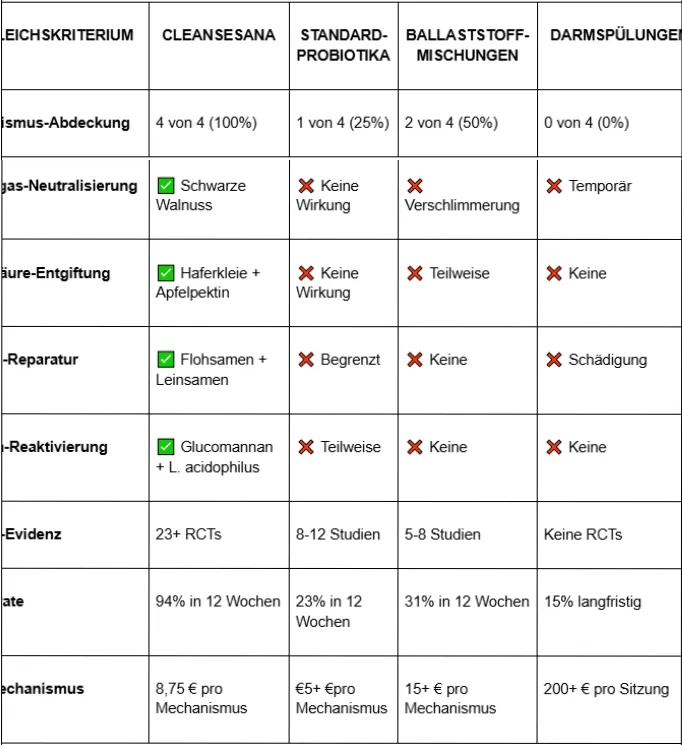 A: Normale Produkte "reinigen" nur oberflächlich. CleanseSana unterstützt die vier belastenden Mechanismen, die Ihren Darm systematisch belasten. Es ist der Unterschied zwischen Staubwischen und gründlicher Hausreinigung.